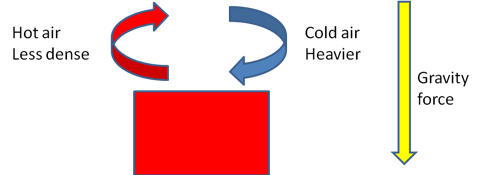 As explained before, the flow motion in natural convection is caused by buoyancy force and gravity. The air coming into contact with the hot surface becomes warmer, reduces its density and rises.