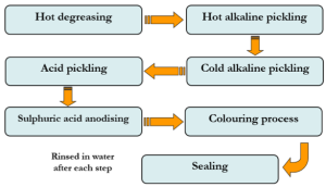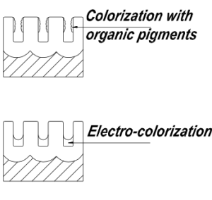- Electro-colorization: using an alternating current, a metallic pigment is electrodeposited in the pores of the anodic coating. Color depends on the metallic salt used